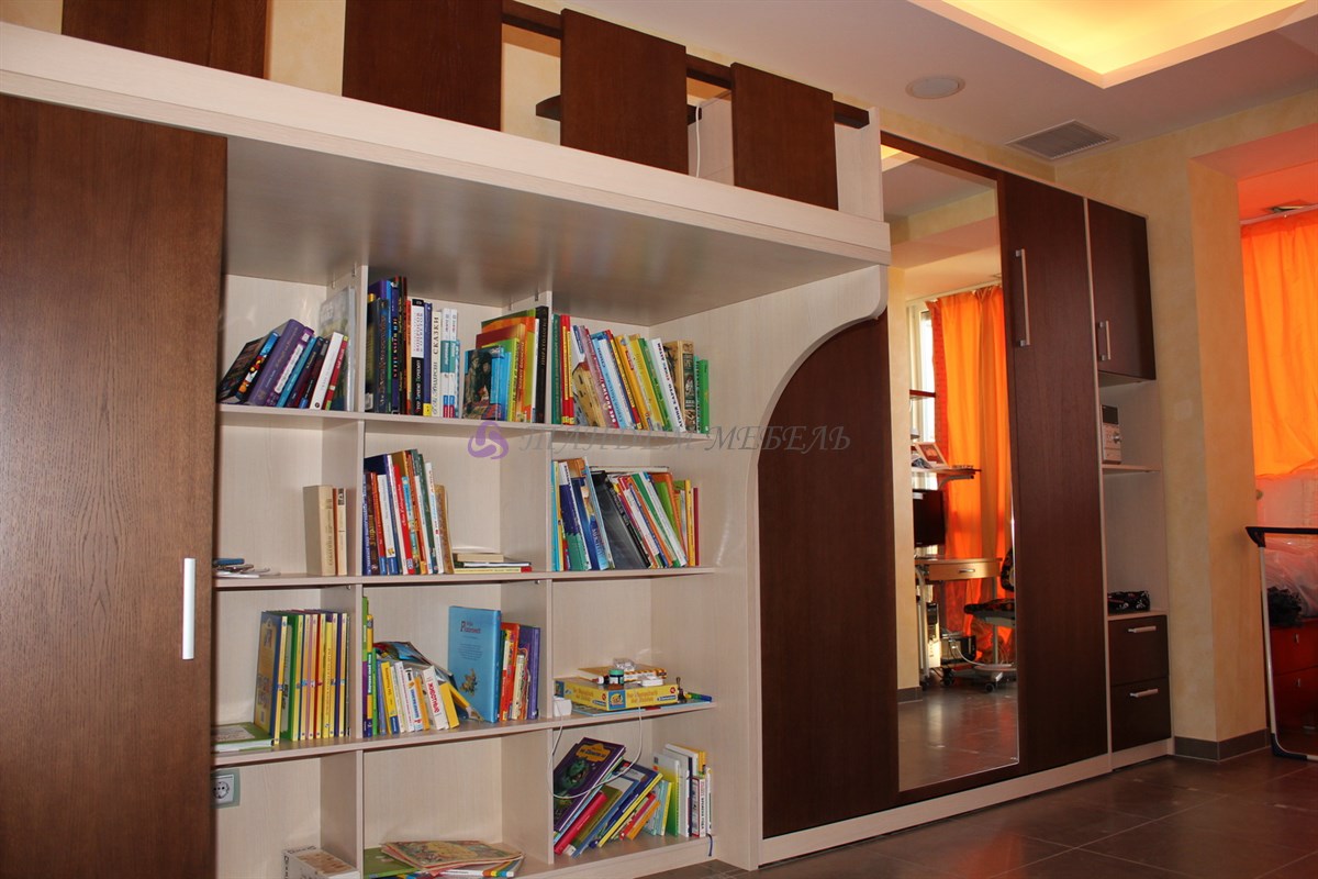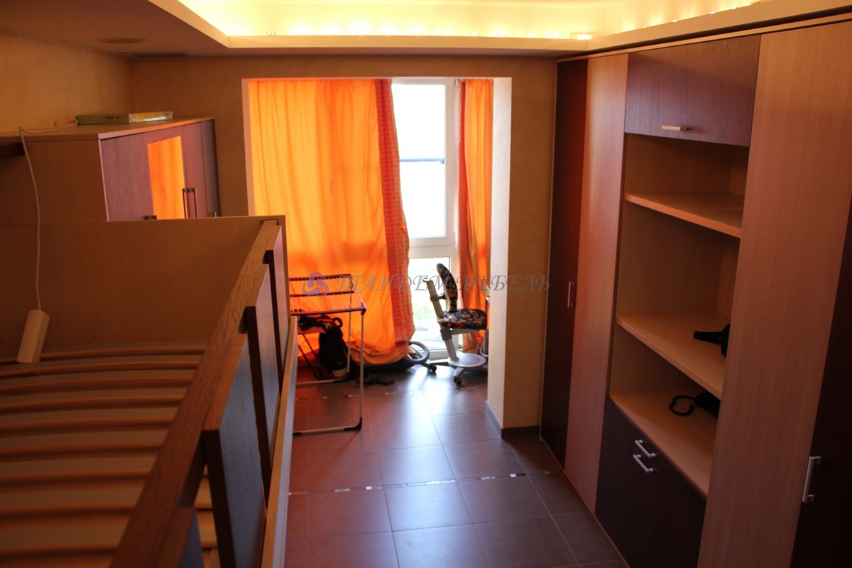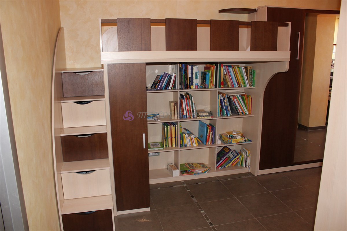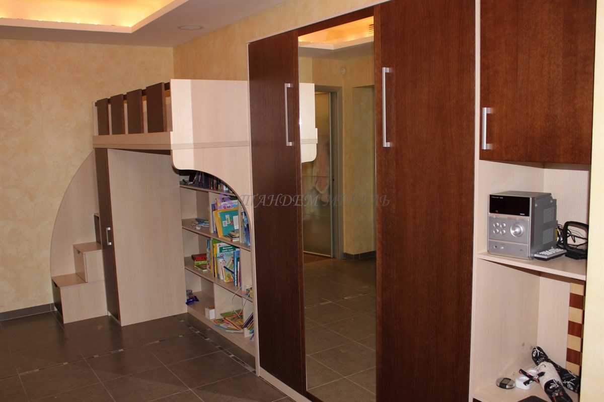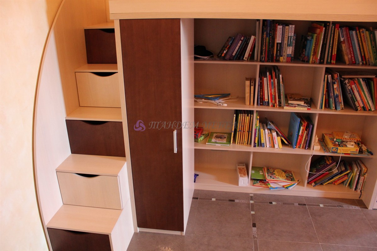 Стильно и оригинально смотрится зона детской части квартиры. Кроме эстетической привлекательности следует отметить надежность материалов и безопасность конструкции, которую составляет кровать-чердак, пенал и открытые полки. На импровизированный второй этаж ребенок поднимается по широким устойчивым ступенькам, которые одновременно являются выдвижными ящиками для хранения игрушек, обуви или одежды.