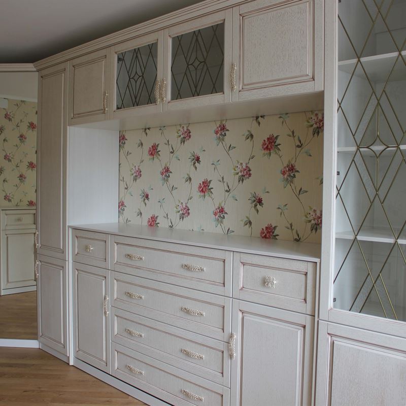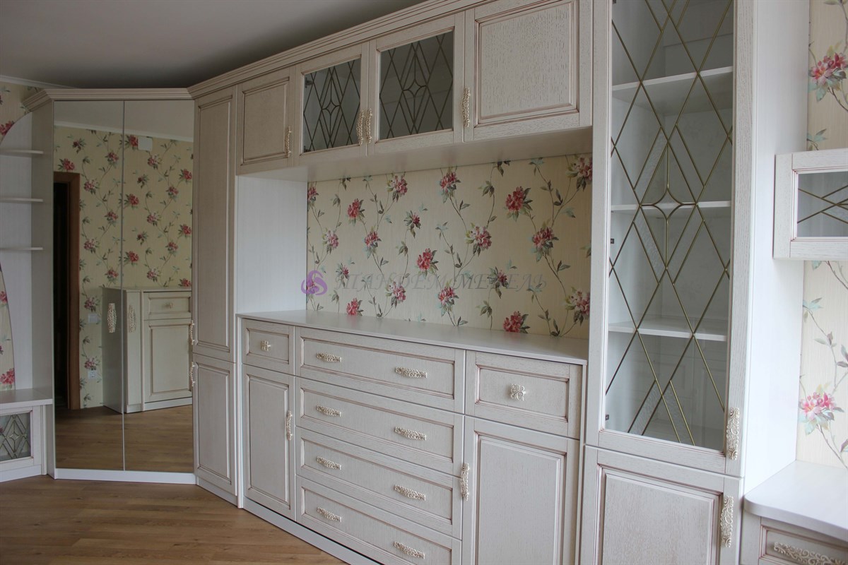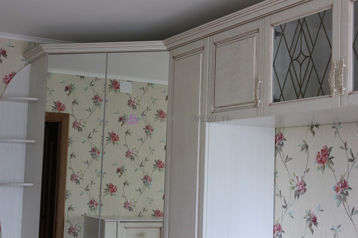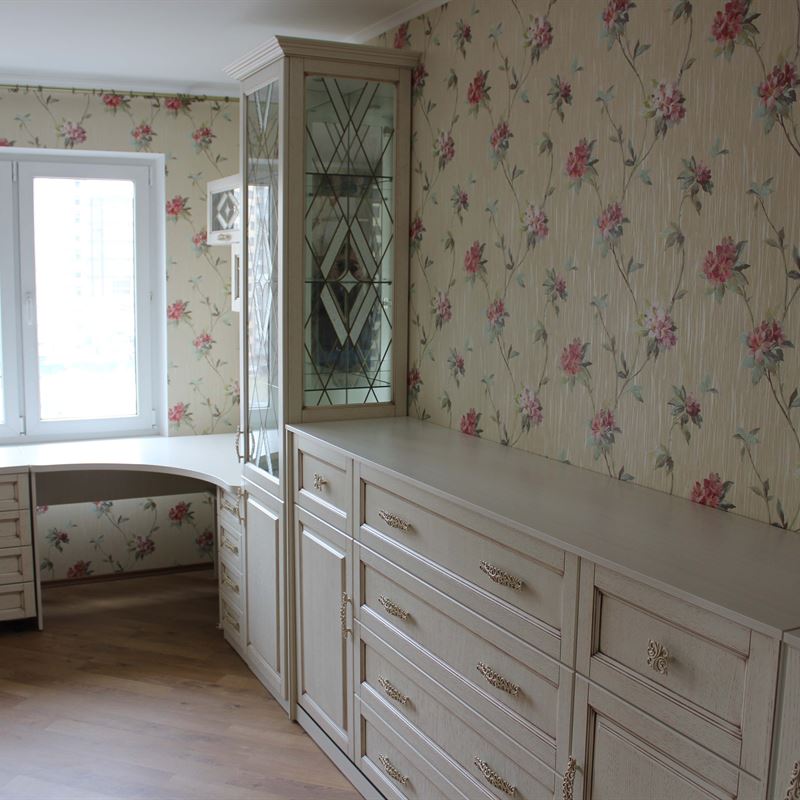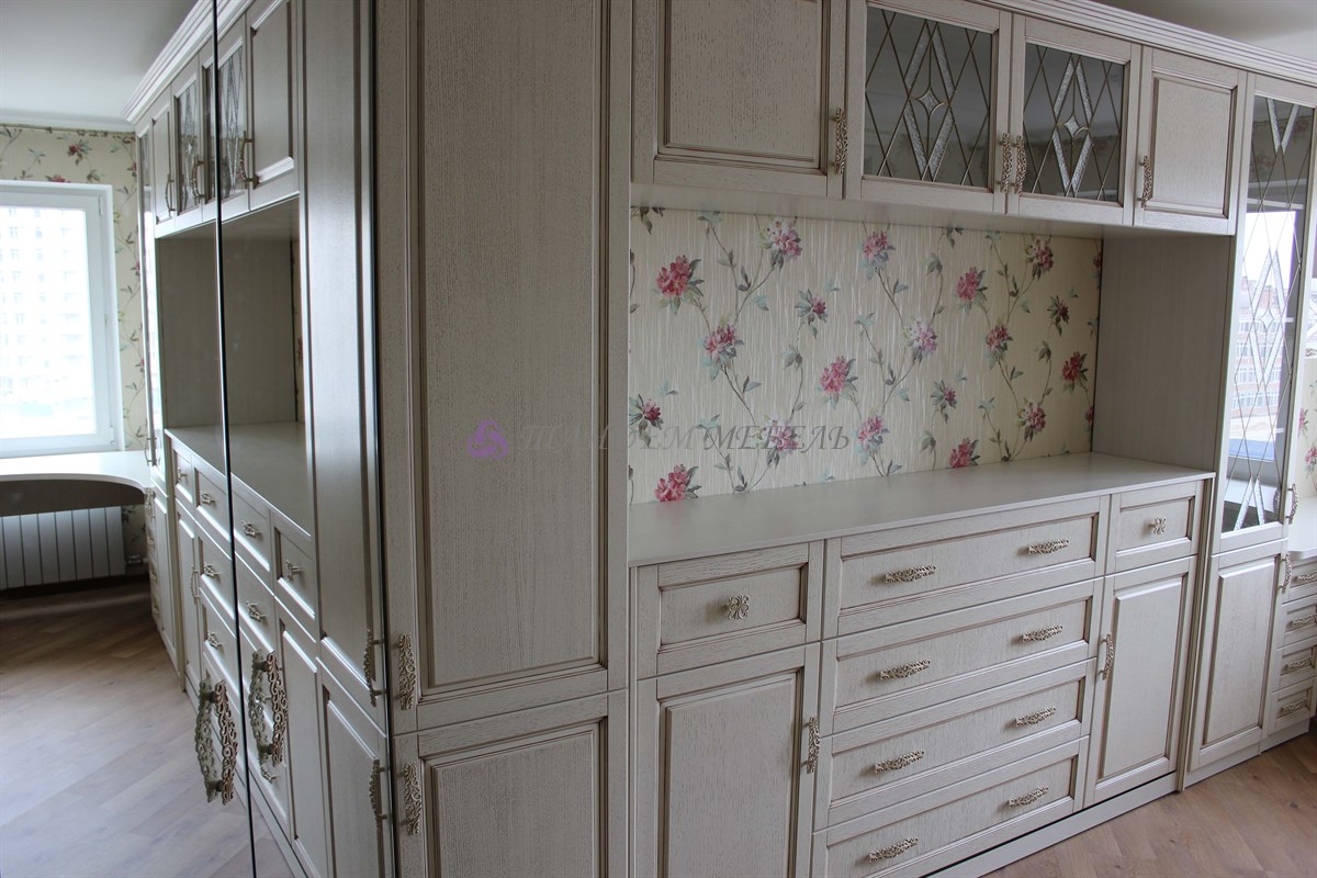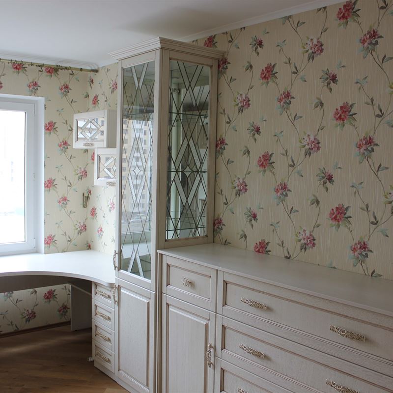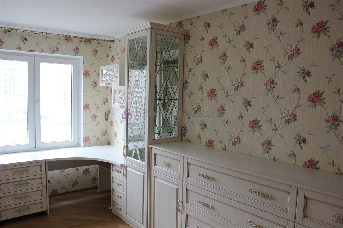 - В-третьих, использование в детской мебели на заказ из массива зеркал и стеклянных витражей, декорированных в тон фурнитуры, придает композиции легкость.
