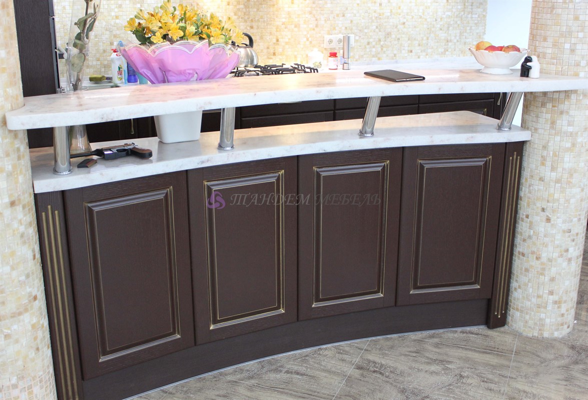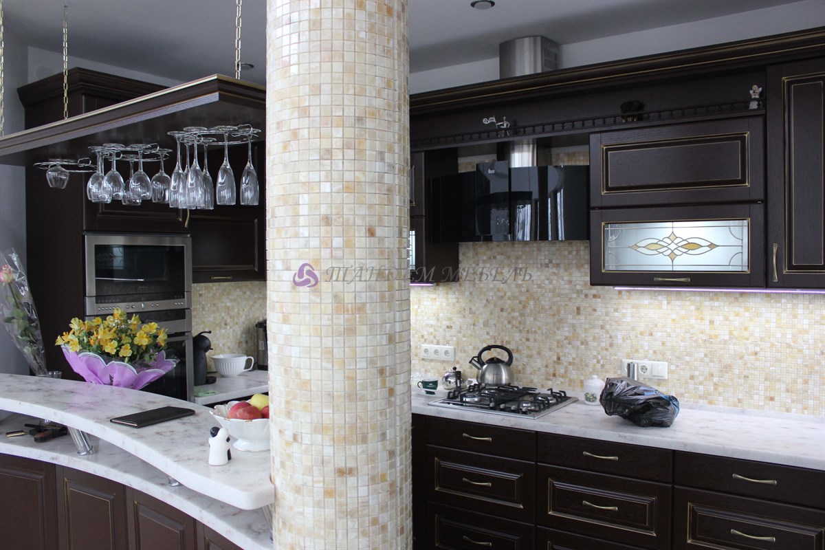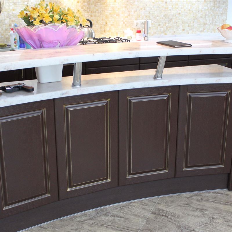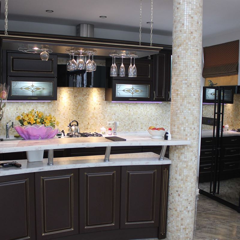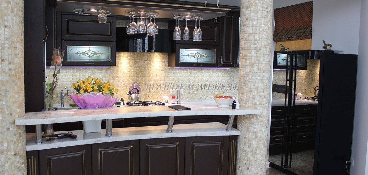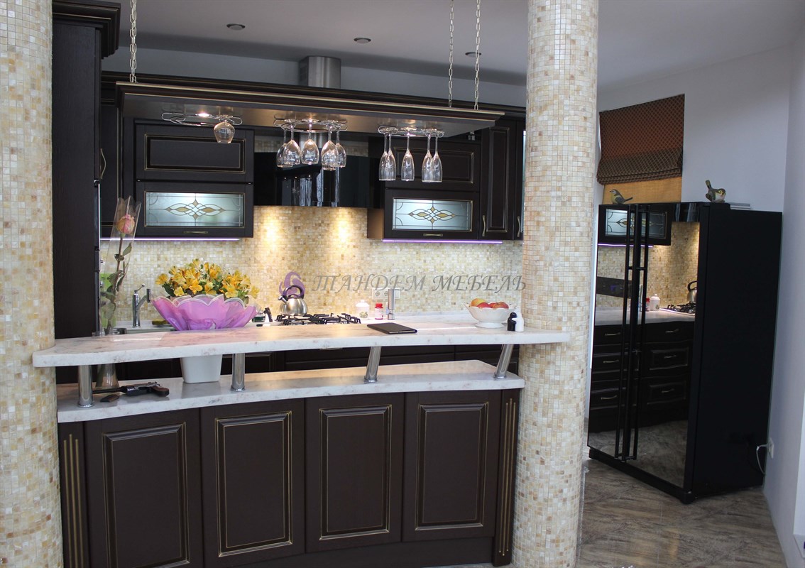 Желание обустроить свой дом красиво, комфортно и неповторимо у каждого владельца недвижимости находит свое оригинальное воплощение. Кто-то делает ставку на внедрение ультрамодных новинок, иные идут по проверенному пути – устанавливают мебель из массива на заказ в классическом стиле. Роскошная темная кухня с контрастной светлой столешницей была изготовлена на заказ для загородного дома, после установки мебели помещение кардинально преобразилось, приобрело эксклюзивный шикарный вид.