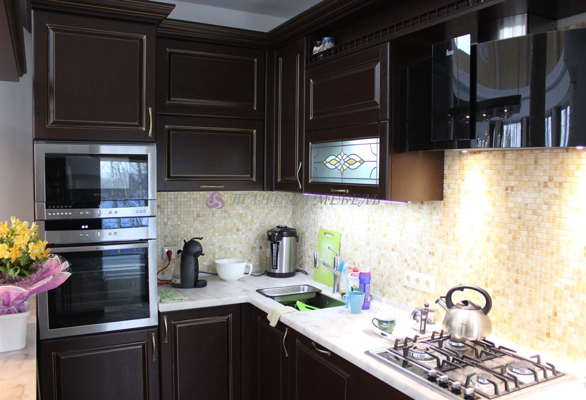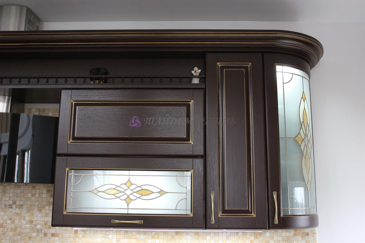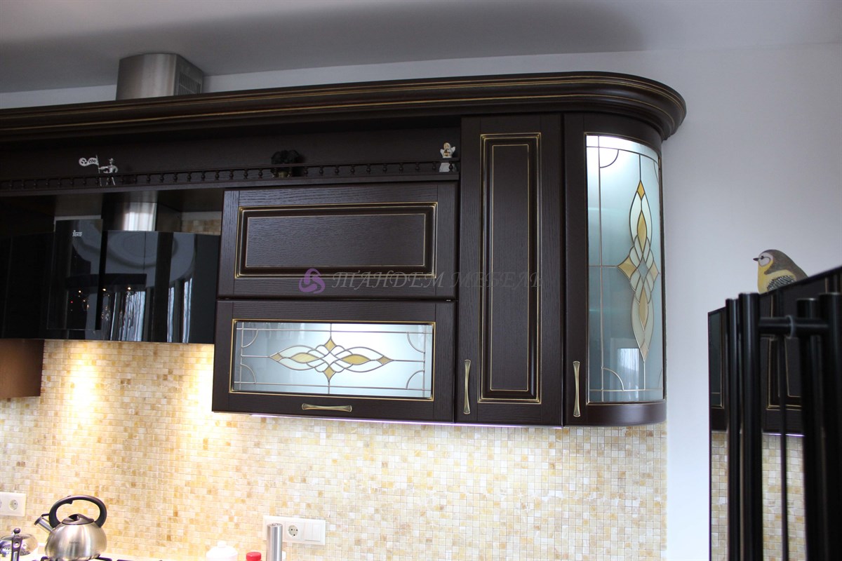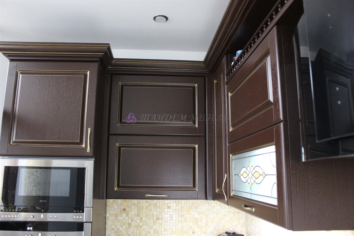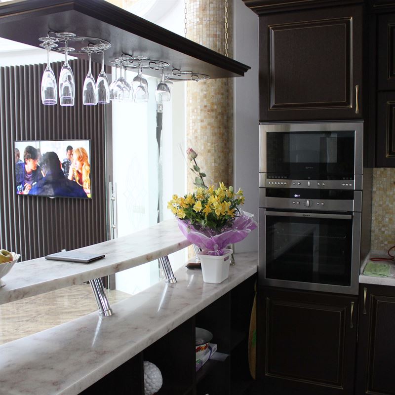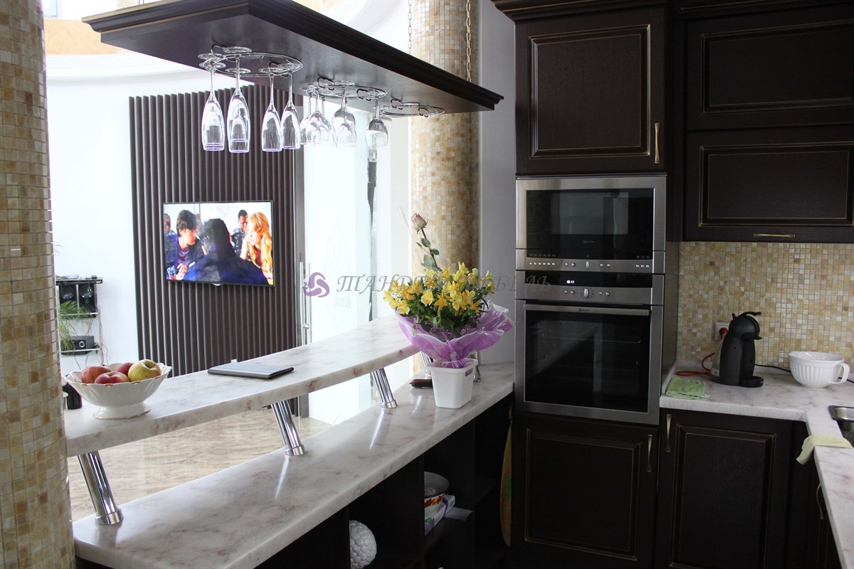 Желание обустроить свой дом красиво, комфортно и неповторимо у каждого владельца недвижимости находит свое оригинальное воплощение. Кто-то делает ставку на внедрение ультрамодных новинок, иные идут по проверенному пути – устанавливают мебель из массива на заказ в классическом стиле. Роскошная темная кухня с контрастной светлой столешницей была изготовлена на заказ для загородного дома, после установки мебели помещение кардинально преобразилось, приобрело эксклюзивный шикарный вид.