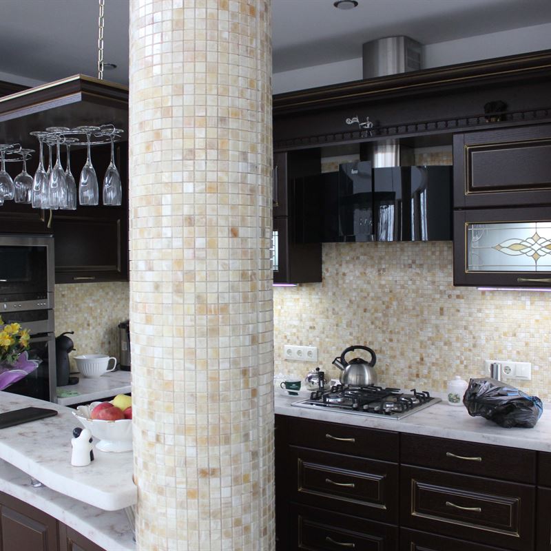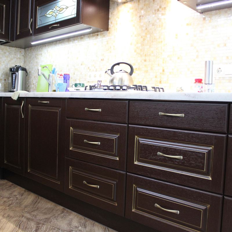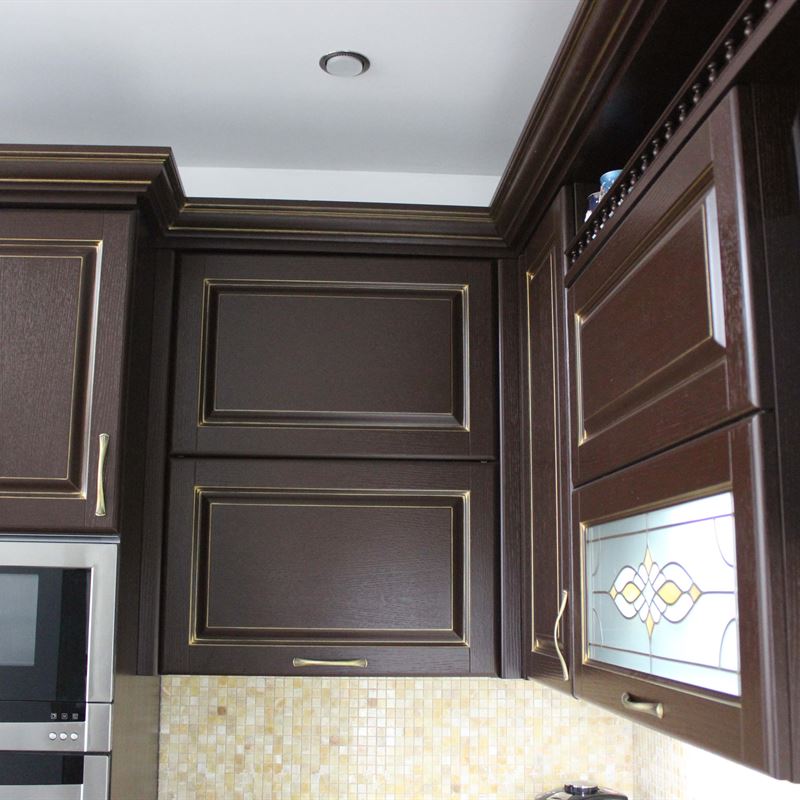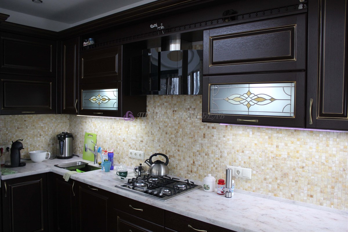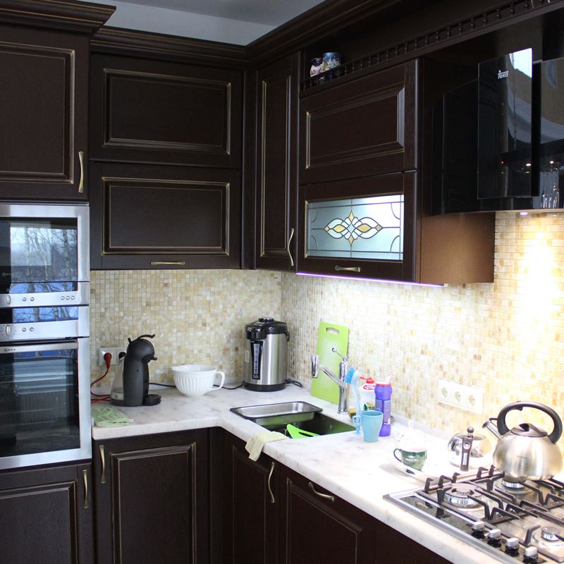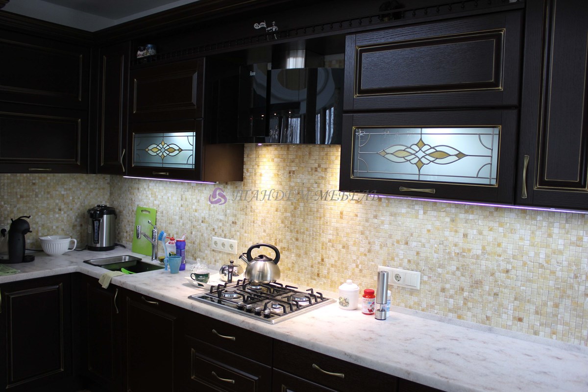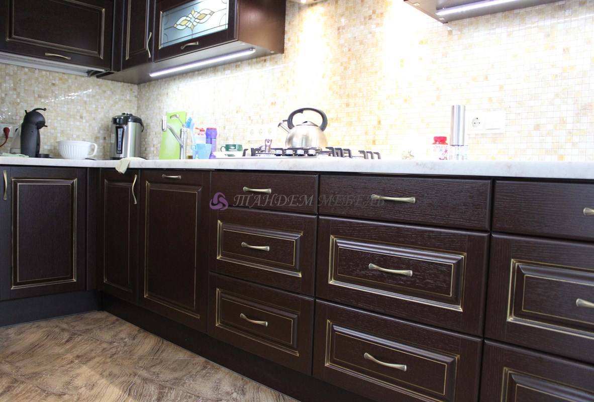 Желание обустроить свой дом красиво, комфортно и неповторимо у каждого владельца недвижимости находит свое оригинальное воплощение. Кто-то делает ставку на внедрение ультрамодных новинок, иные идут по проверенному пути – устанавливают мебель из массива на заказ в классическом стиле. Роскошная темная кухня с контрастной светлой столешницей была изготовлена на заказ для загородного дома, после установки мебели помещение кардинально преобразилось, приобрело эксклюзивный шикарный вид.