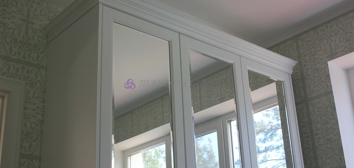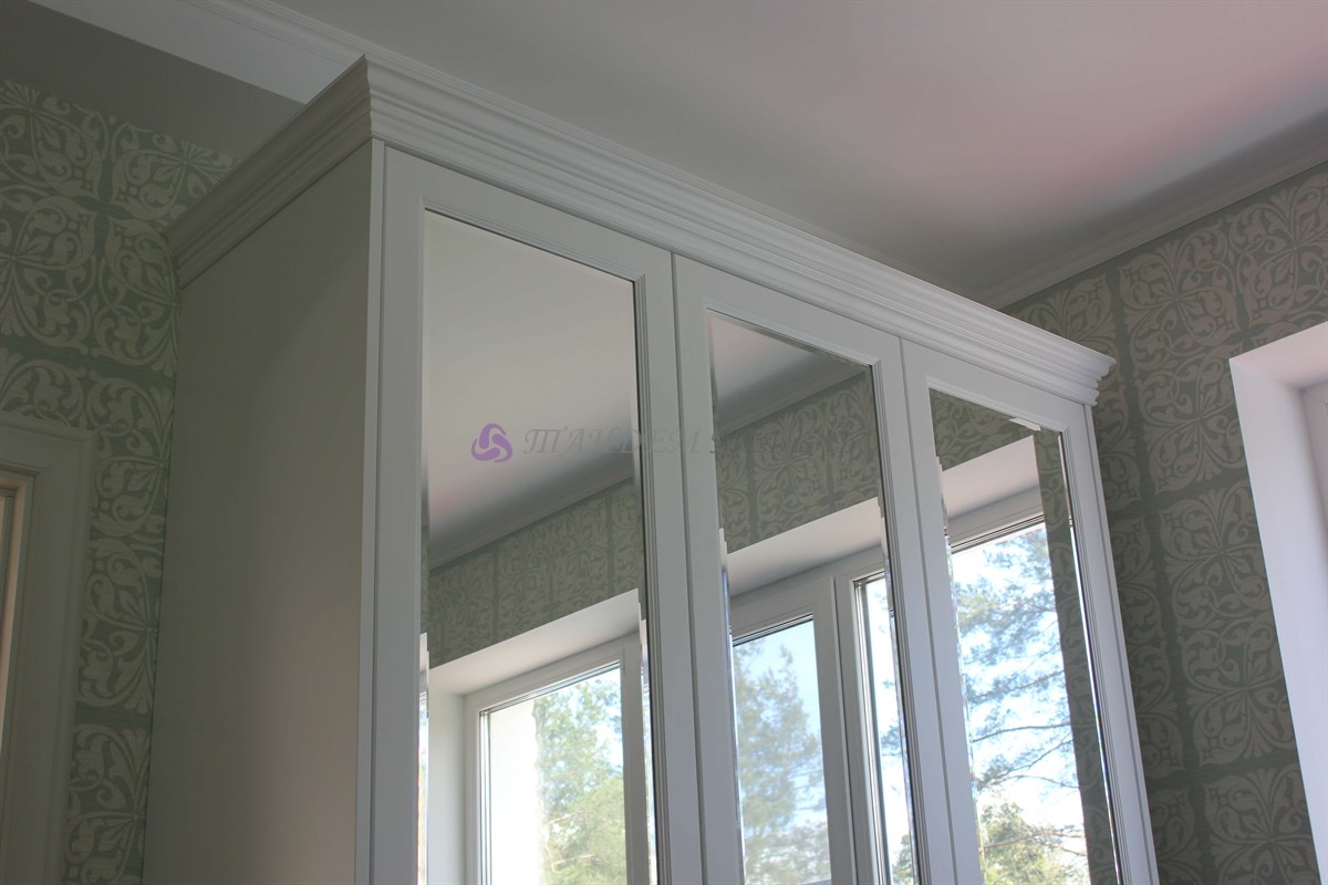 Применение зеркал в каждой двери трехстворного шкафа визуально облегчает, делает практически невесомой на самом деле достаточно тяжелую и основательную конструкцию. Широкий и глубокий шкаф из массива даже при высоте практически «под потолок» смотрится компактно, изысканно и элегантно. Филигранно обработанный карниз украшает композицию, служит связующим звеном с элементами отделки межкомнатной двери.